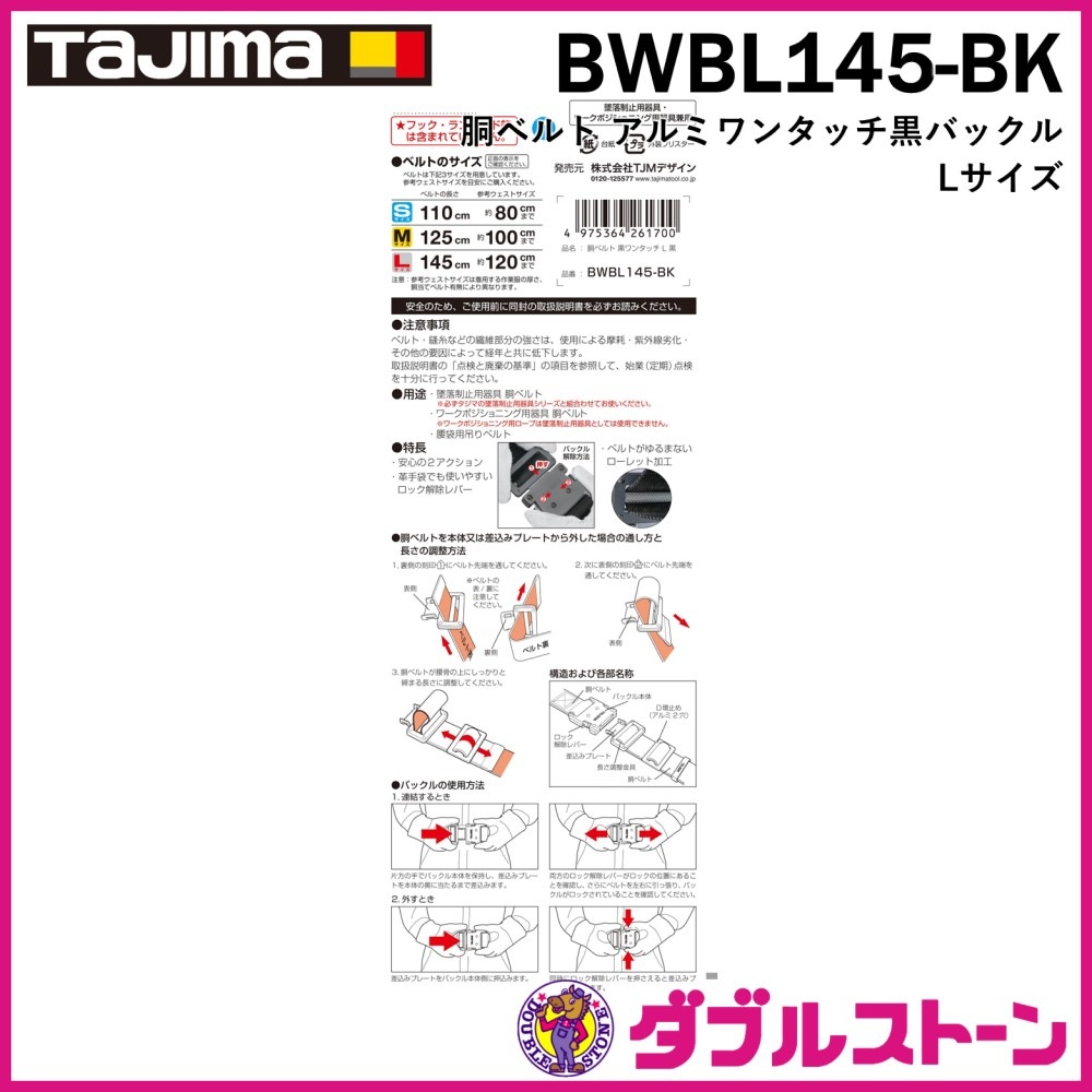 TAJIMA 胴ベルト アルミワンタッチ黒バックル Lサイズ BWBL145-BK